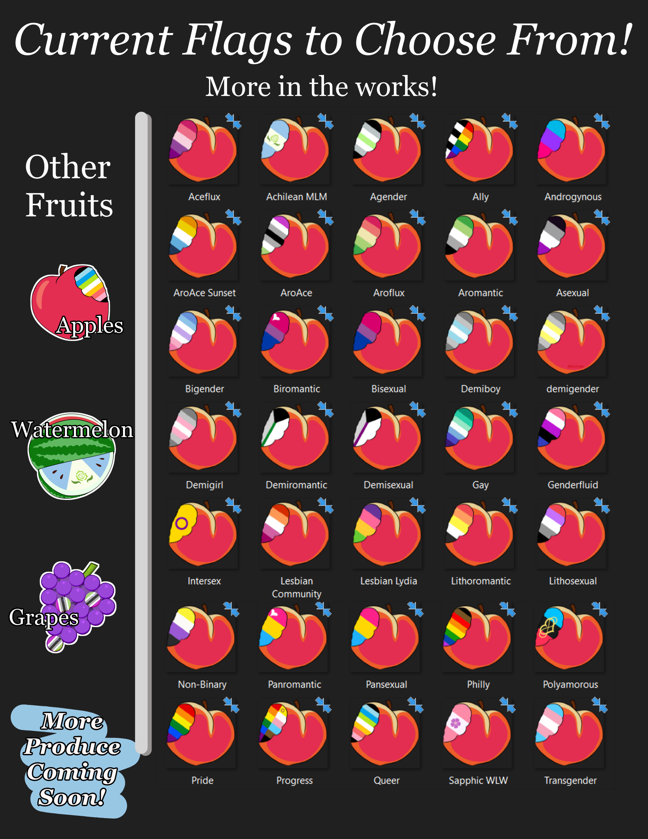 • 35 flags and 4 fruits to choose from! Mix and match! See Image below.